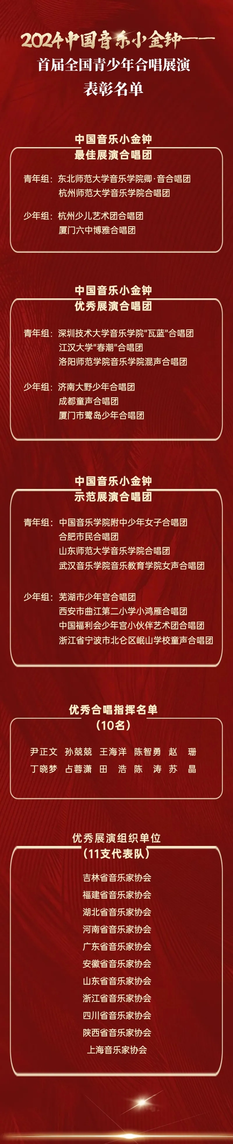 叶小钢在致辞中表示,本次展演既是一次音乐的盛宴,更是一次心灵的交流。展演期间,来自全国的40支合唱团、2000余名青少年,用纯净而美妙的歌声唱响了青春的旋律,展现了新时代青少年的蓬勃朝气与艺术风采,传递了团结、友爱与奋进的力量。举办的公益巡演等系列活动,彰显了以人民为中心的工作导向,展示了合唱艺术的独特魅力,扩大了小金钟合唱展演的关注度和影响力。希望展演团员们以此次活动为新的起点,用歌声传递爱与希望,用音乐书写精彩人生。