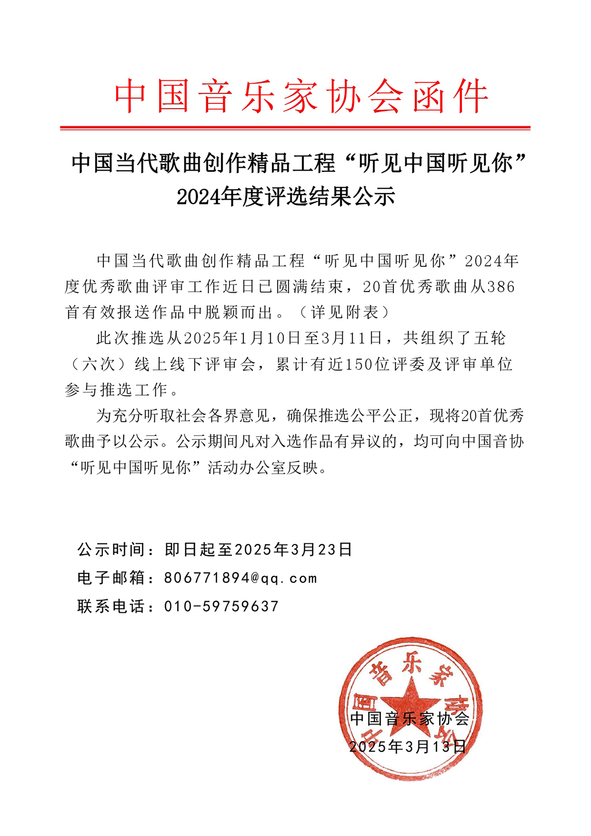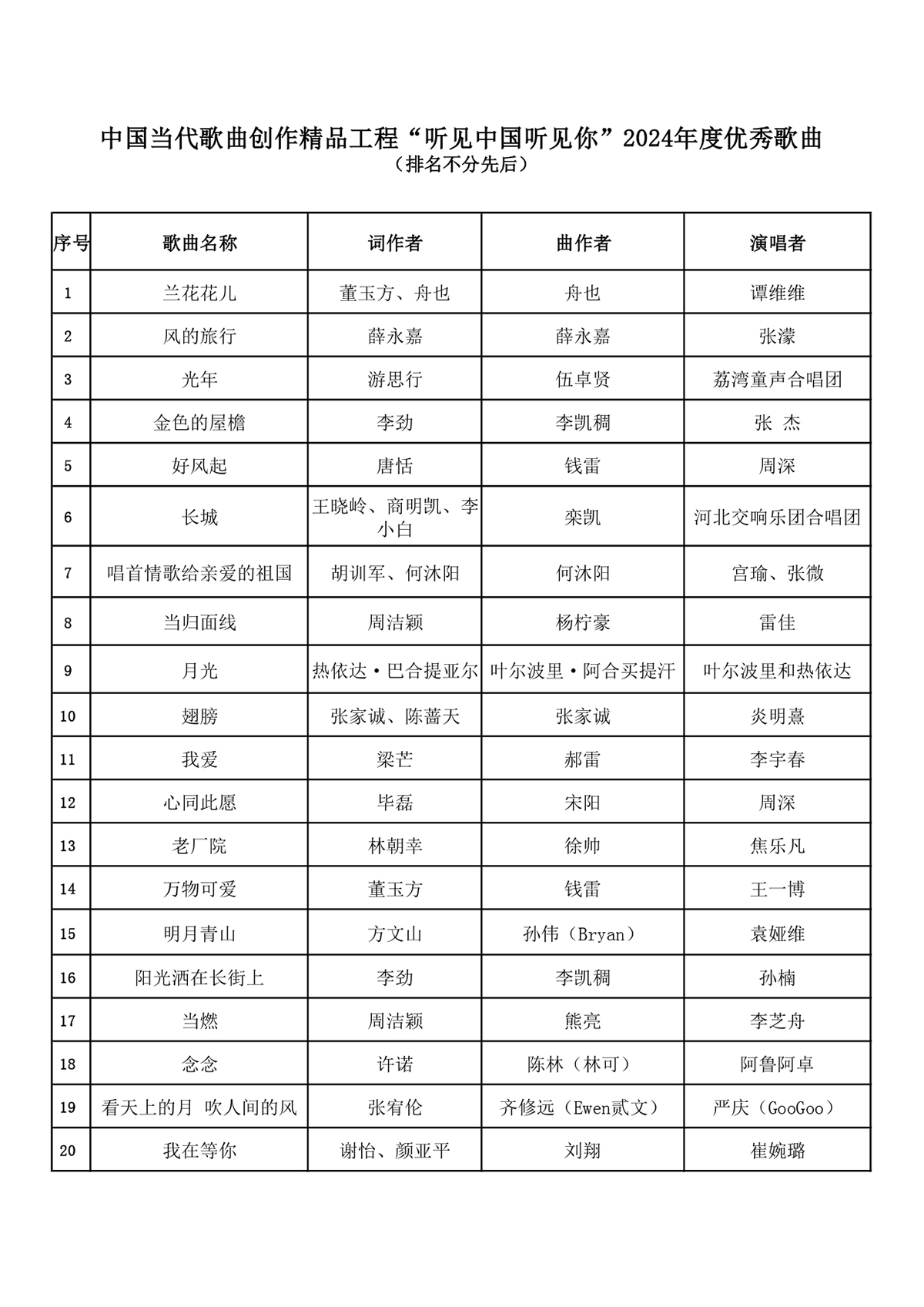 中国当代歌曲创作精品工程“听见中国听见你” 2024年度评选结果公示